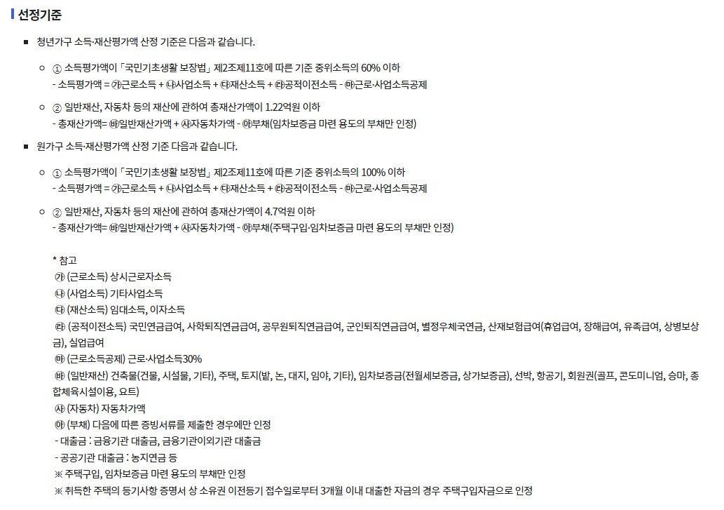 | 재산 기준 | 청년가구 1억 2,200만 원 이하 / 원가구 4억 7,000만 원 이하 |