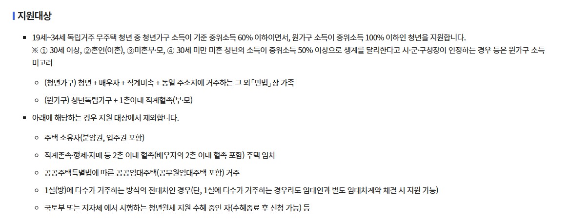 | 소득 기준 | 청년가구 중위소득 60% 이하 / 원가구 중위소득 100% 이하 |